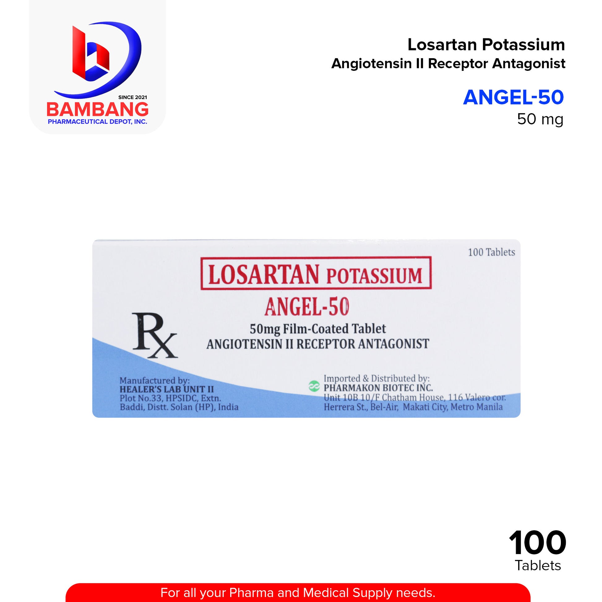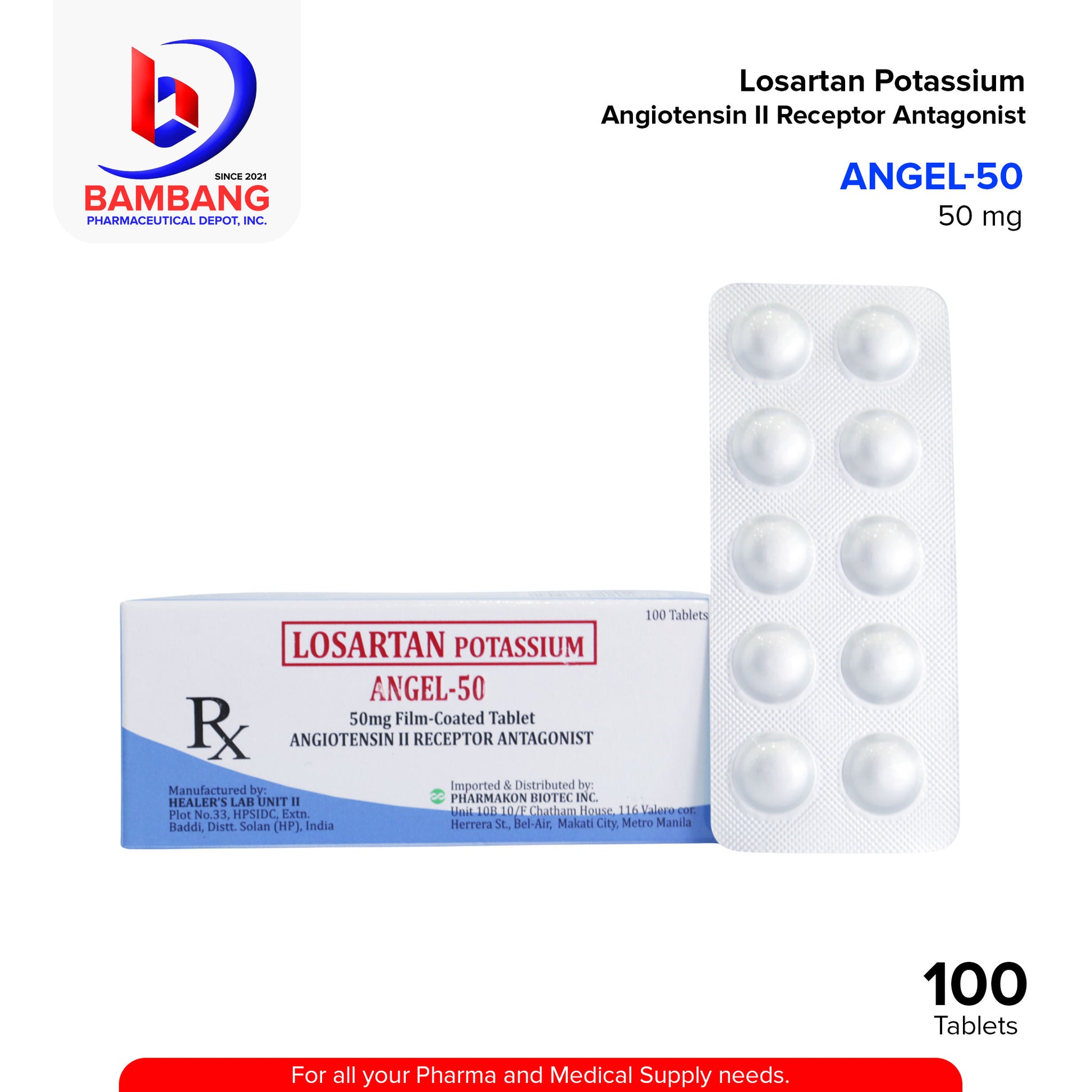 ANGEL 50 Losartan Potassium 50 mg Tablet is an angiotensin II receptor blocker (ARB) used to help support the management of high blood pressure and protect kidney function in certain patients, such as those with type 2 diabetes. It works by relaxing blood vessels, improving blood flow, and reducing strain on the heart. Use only as directed by a healthcare professional.