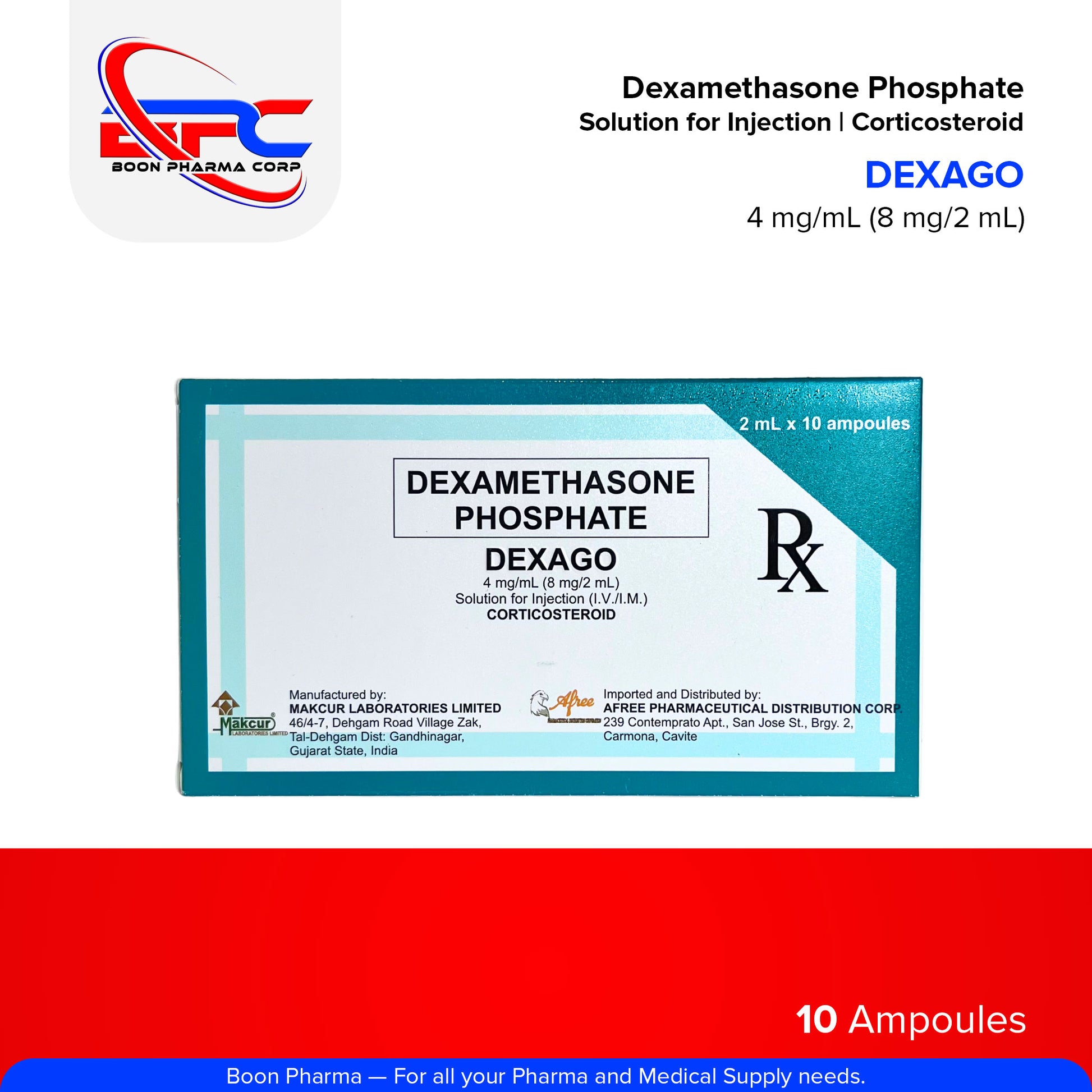 DEXAGO Dexamethasone Phosphate 4 mg/mL (8 mg/2 mL) Solution for Injection is a corticosteroid used to treat a wide range of inflammatory and autoimmune conditions. It is administered intravenously or intramuscularly for rapid management of severe allergic reactions, shock, cerebral edema, and other acute inflammatory disorders.