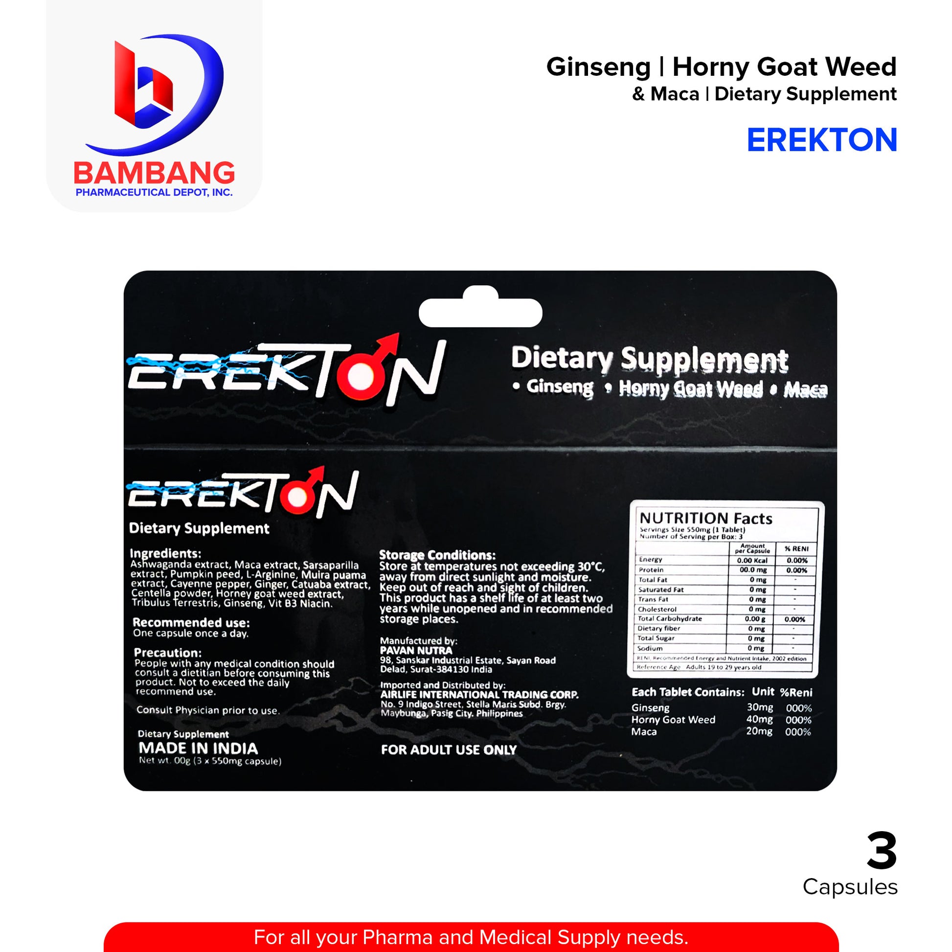 EREKTON is a dietary supplement formulated with Ginseng, Horny Goat Weed, and Maca. This combination is traditionally used to support men’s vitality, enhance stamina, boost energy, and promote sexual wellness.