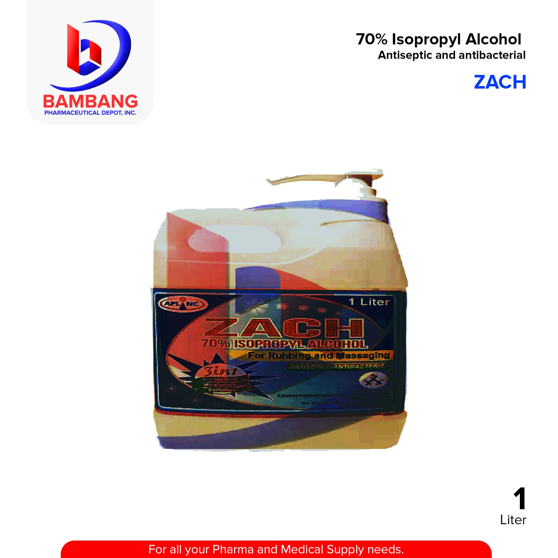 Zach Isopropyl Alcohol 70% is an antibacterial antiseptic solution formulated for sanitizing skin and disinfecting surfaces. It helps eliminate common germs and bacteria and is suitable for first aid use, hand sanitizing, and general surface disinfection. For external use only and highly flammable.