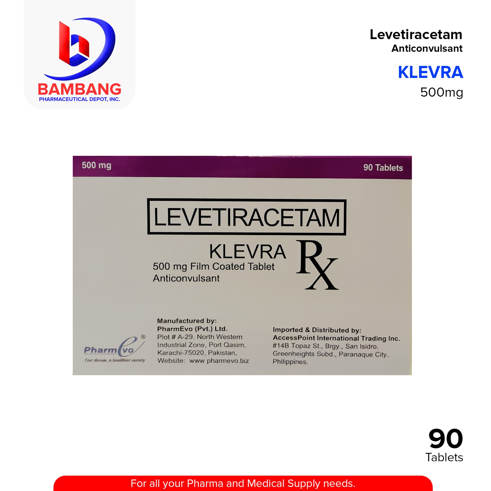 Klevra Levetiracetam 500mg film-coated tablets is an anticonvulsant indicated for the treatment of partial-onset seizures, myoclonic seizures, and primary generalized tonic-clonic seizures. It works by modulating synaptic neurotransmitter release through binding to synaptic vesicle protein SV2A. To be taken as prescribed by a physician.