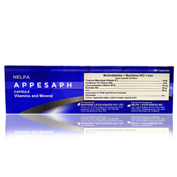 Appesaph Multivitamins + Buclizine HCI + Iron Capsules are a combination of essential vitamins, minerals, and iron, enriched with Buclizine Hydrochloride (HCI). This combination is designed to provide nutritional support and is particularly useful for individuals who need to boost their overall health, address vitamin and mineral deficiencies, or enhance appetite.