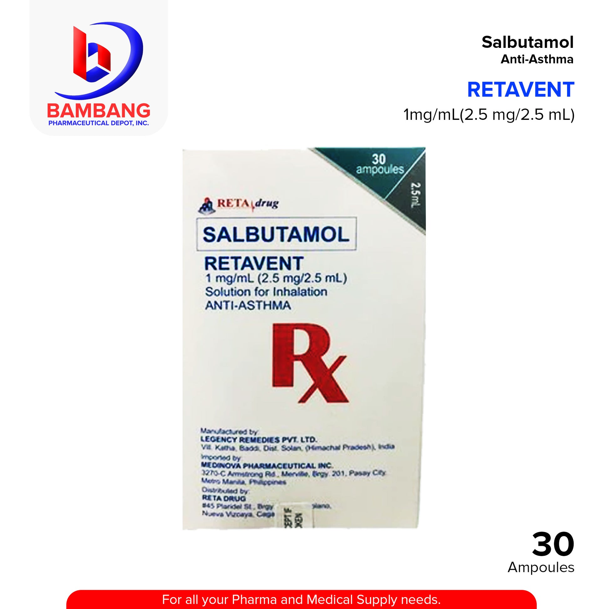RETAVENT Salbutamol 1mg/ml (2.5mg/2.5ml) Solution For Inhalation Anti Asthma Ampoules 30's