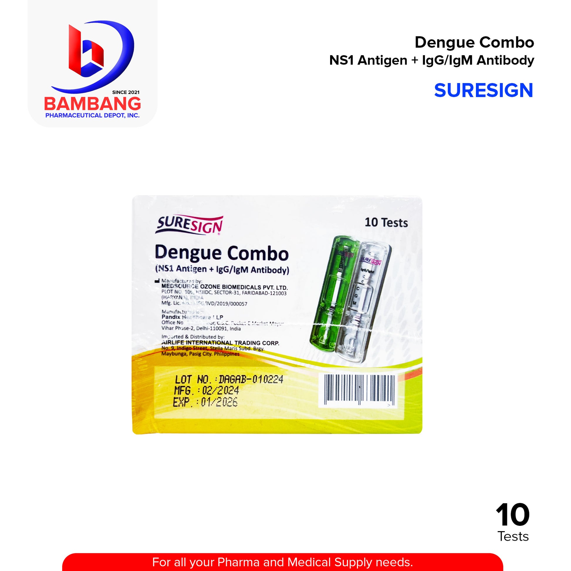SURESIGN Dengue Combo Test Kit is a rapid diagnostic test used to help support the early detection of dengue virus infection. It detects both NS1 antigen and IgG/IgM antibodies from a small blood sample. Designed for fast and reliable results in clinical and field settings. Use only as directed by a healthcare professional.