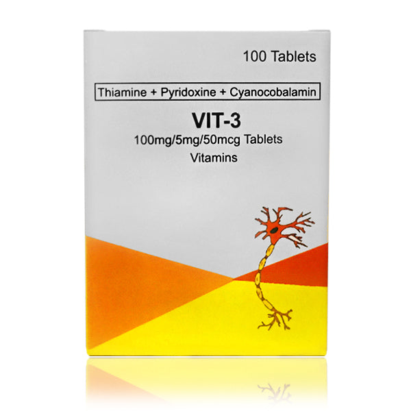 Thiamine + Pyridoxine HCl + Cyanocobalamin (Vit 3) 100mg/5mg/50mcg Tablets is a combination supplement containing three essential B vitamins: