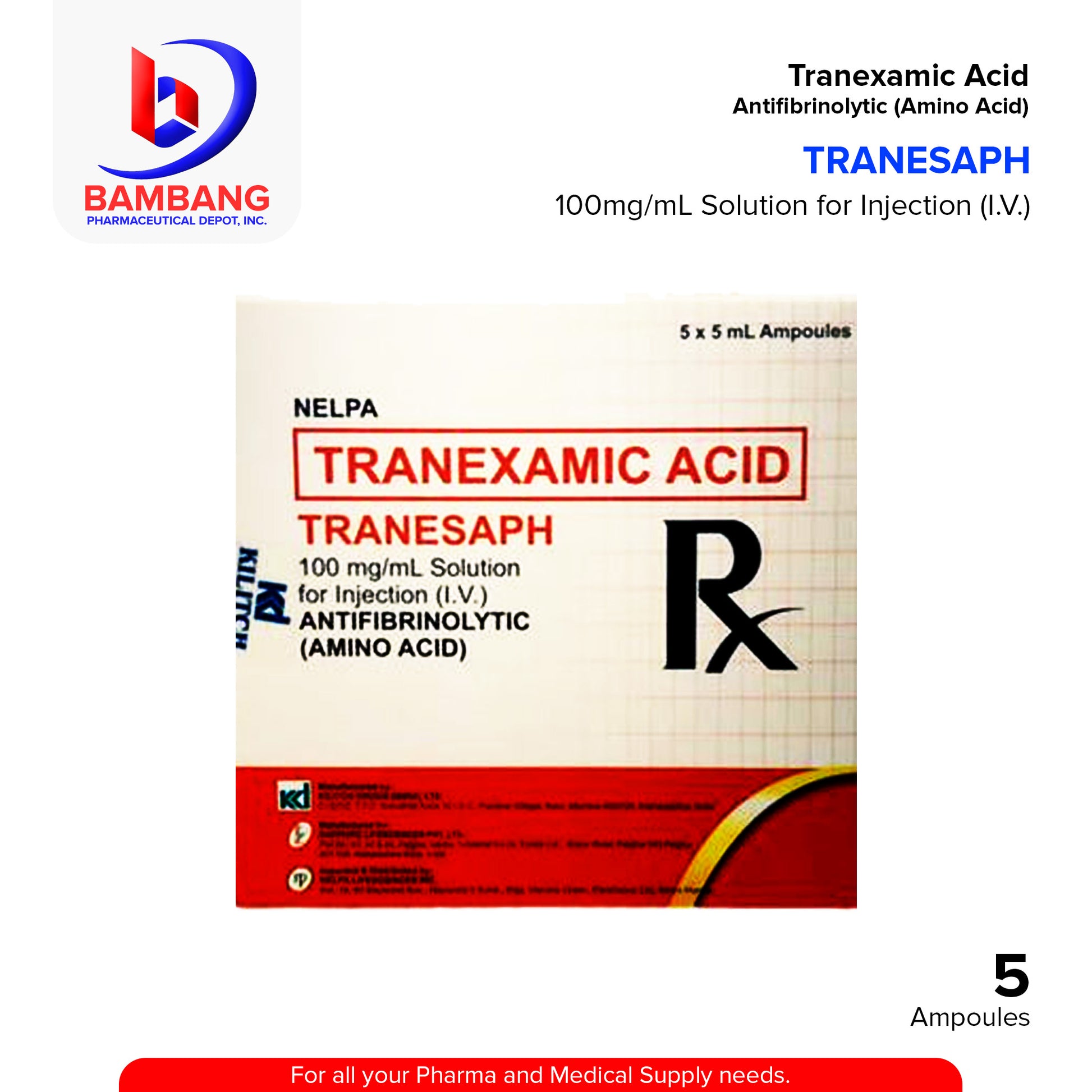 TRANESAPH Tranexamic Acid 100mg/ml Solution for Injection IV 5ml x Ampoules 5's